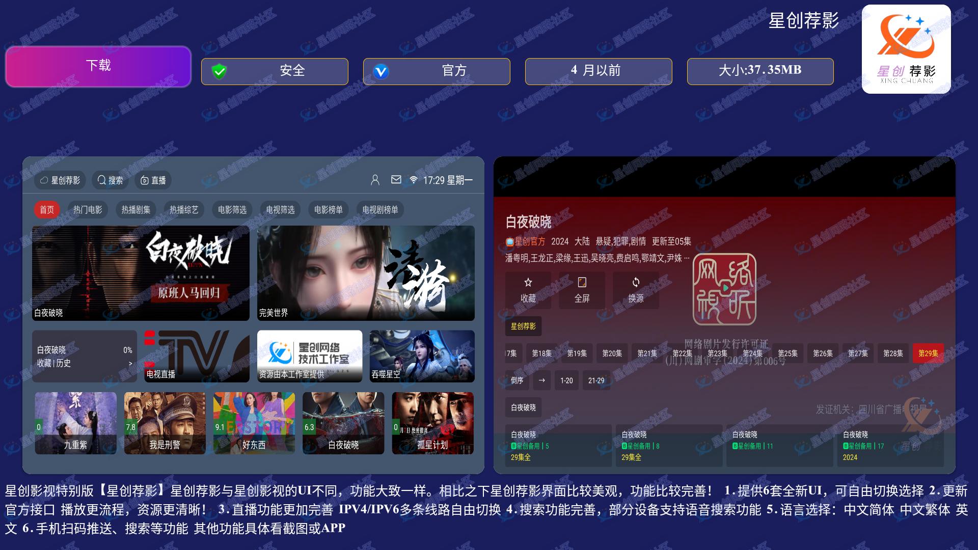 星创市场电视版是专为智能电视打造的应用商店,在这里用户可以更好的进行应用选择,不同类型的电视应用推荐给你,在这里有很多影视、音乐、教育等电视应用在这里推荐给你,放心的在线进行应用搜索,喜欢的应用在这里都是可以找到的,放心的在线进行应用搜索,喜欢的应用在这里推荐给你,放心的在线进行应用选择。