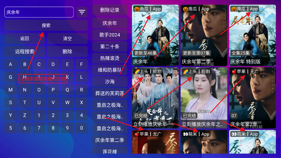 搜索后会出现很多个线路的资源 如图所示:南瓜 苹果 上头 萌米 等资源 比如你播放南瓜线路的资源出现问题:卡顿 闪退 无法播放等 你可以退出来切换城其他的资源 南瓜不行就换苹果、萌米或者其他资