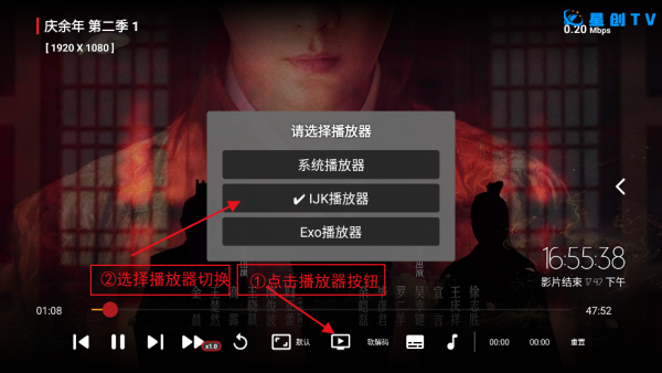 如果还是出现卡顿点击下方播放器图标尝试切换播放器 直到正常播放为止