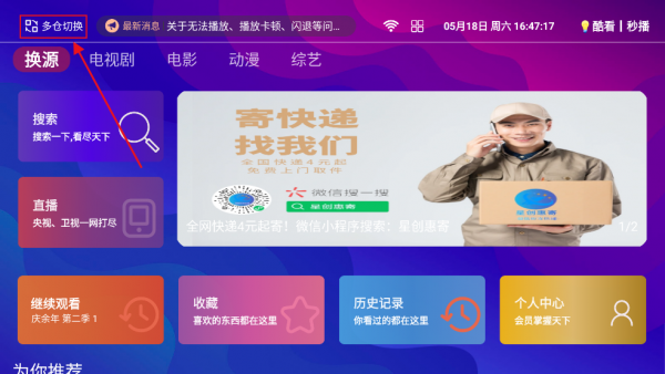# 方法二:多仓切换 - 打开星创影视 - 首页左上角点击 多仓切换 如图所示